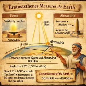 - How did Eratosthenes use the angle measurements to estimate the Earth’s circumference?